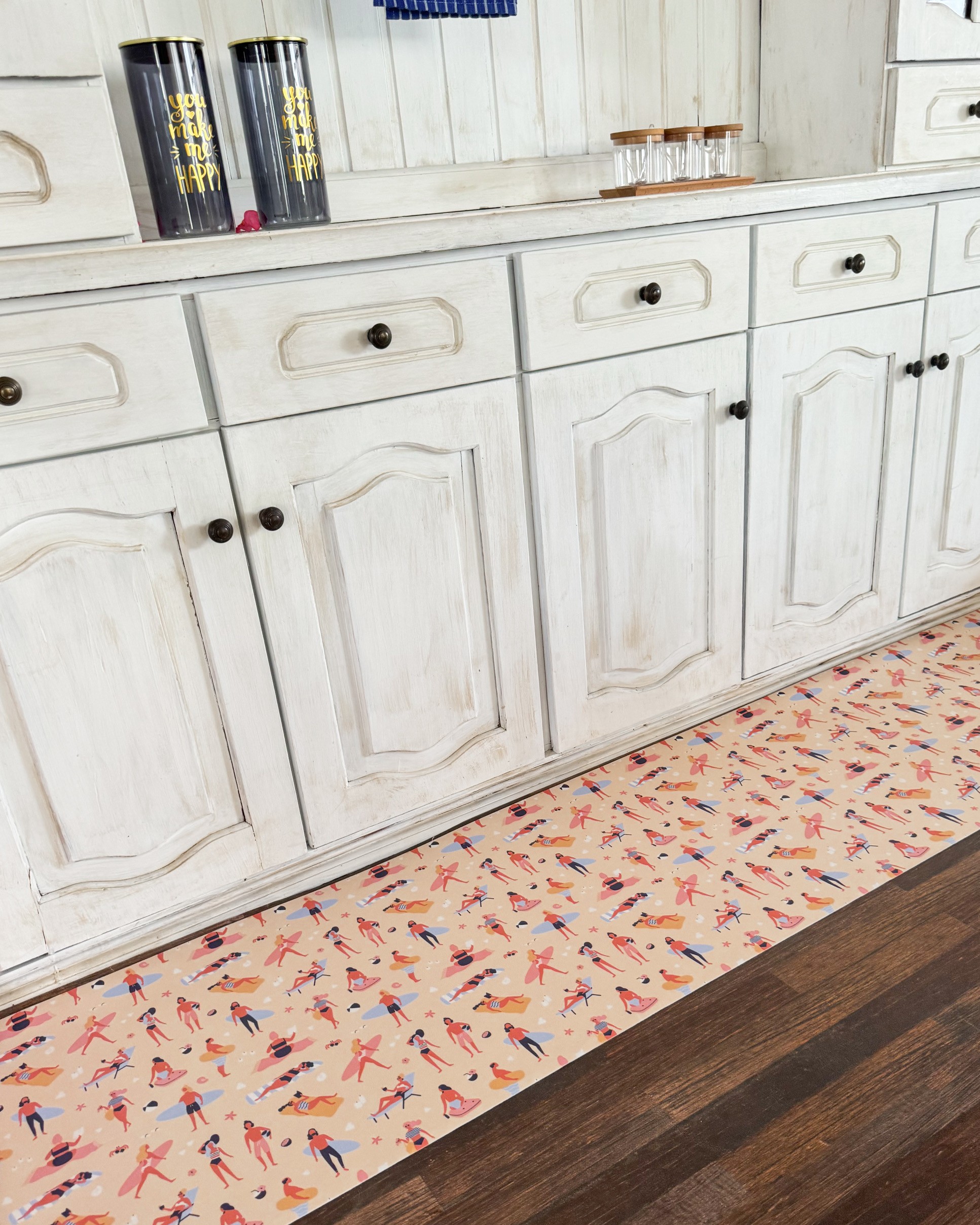 - Passatoia dal simpatico pattern estivo, fondo sabbia con donne e uomini alle prese con la tintarella o le tavole da surf.