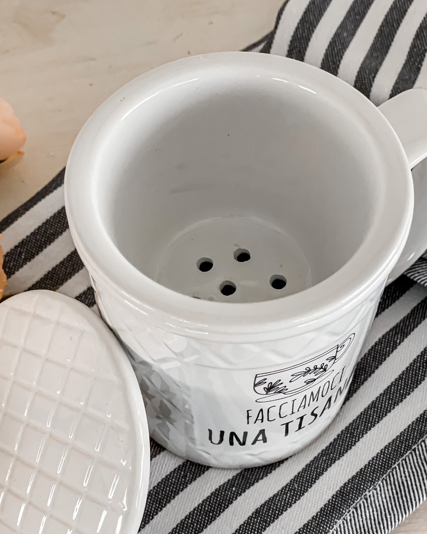 La Tazza per gli amanti delle tisane. Puoi scegliere tra due scritte simpatiche. Dotata di coperchio per tenere calda la bevanda e di filtro in ceramica per gli infusi.
