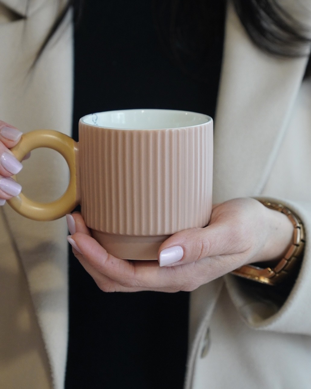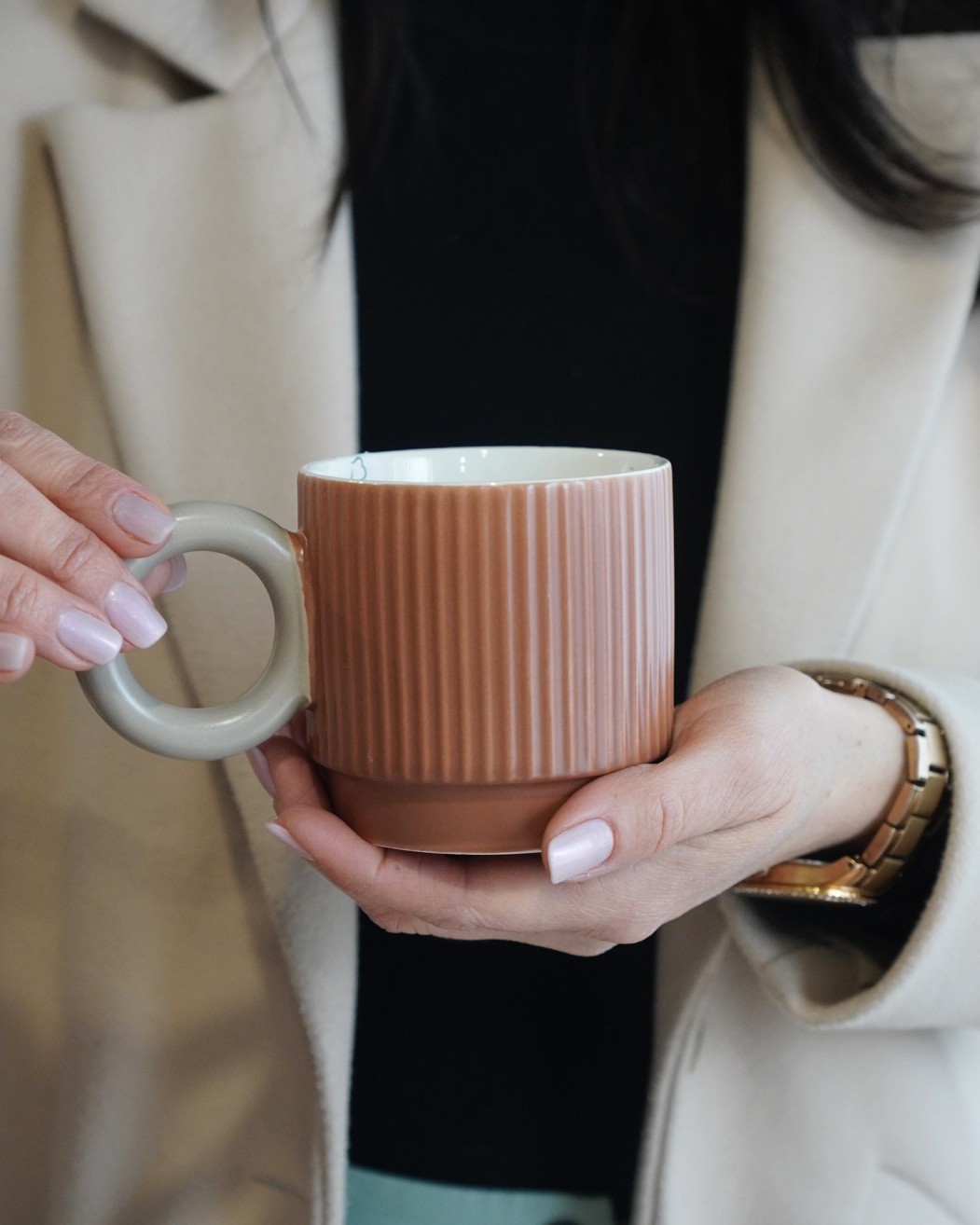 Tazza mug impilabile, disponibile in quattro colori inspirati alla terracotta, con manico circolare con colori in contrasto.