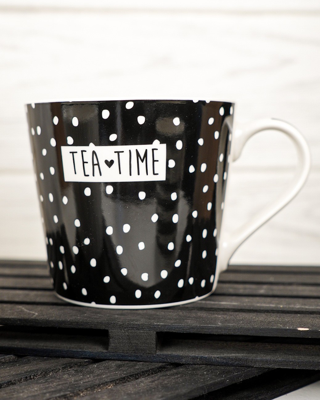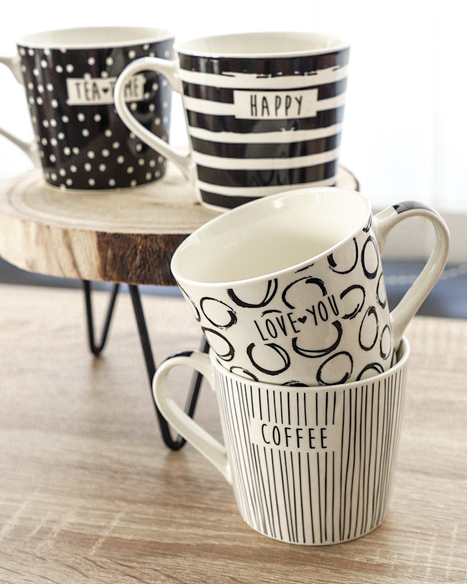 Tazza Party in quattro differenti varianti, tutte le tazze sono in bianco e nero ma con diverse fantasie: a righe con la scritta “Happy”, a pois con la scritta “Tea time”, a righe verticali con la scritta “Coffee” e con cerchi e la scritta “Love you”. Perfette per sorseggiare da soli o in compagnia del thè o del caffè.