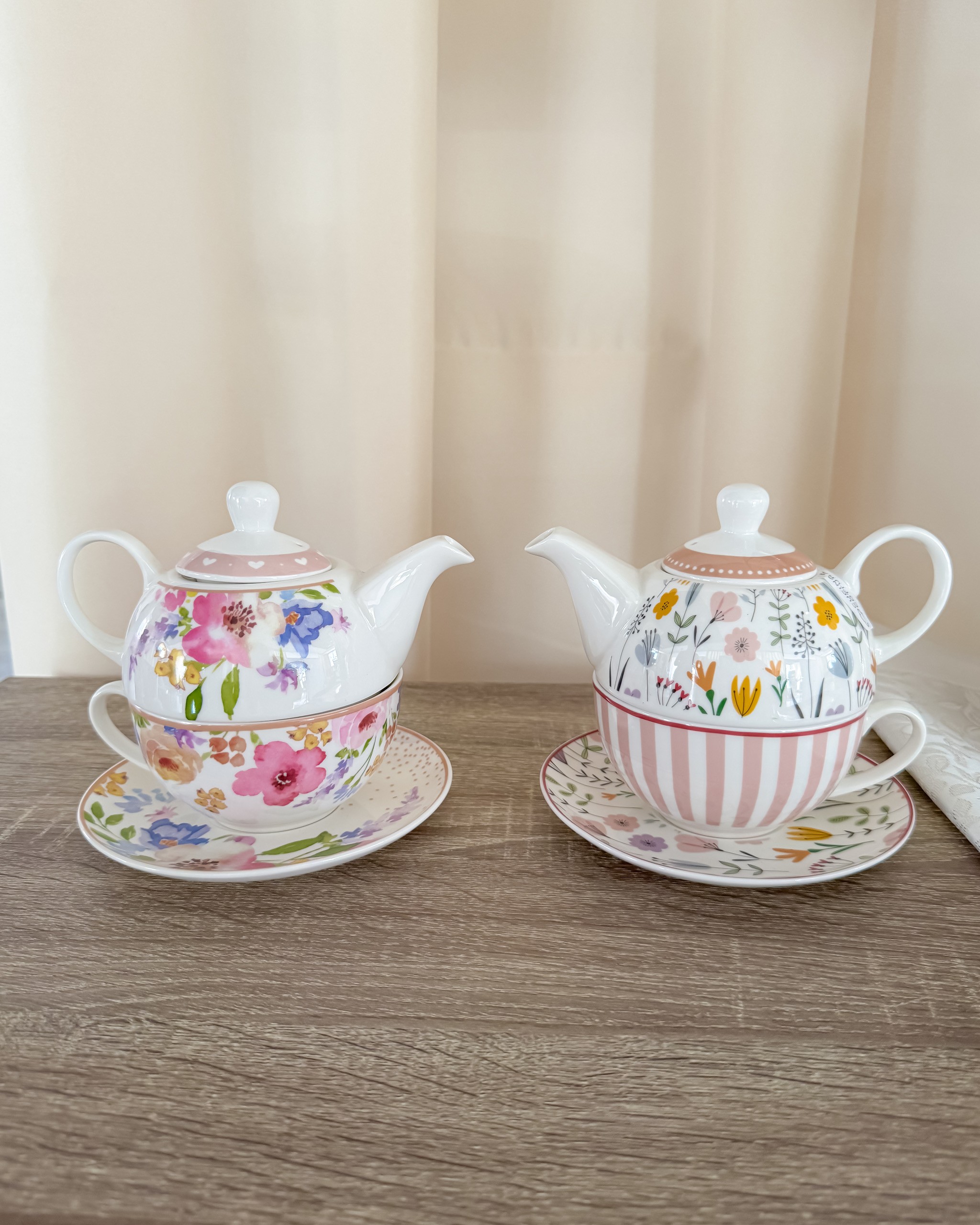 Carinissima teiera Glady, in porcellana. La teiera si sdoppia diventando una tazza con piattino. Disponibile in due fantasie floreale e, volendo, abbinabile al vassoietto della stessa linea che puó essere utilizzato per i biscotti da te. Bella anche come idea regalo.