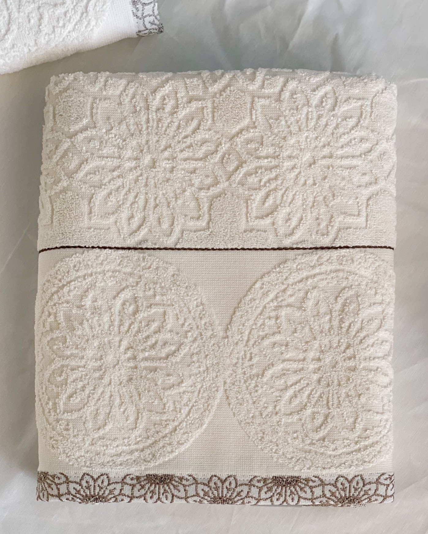 Disponibile in più colori, il telo mare Adel ha un motivo molto delicato nella parte bassa del telo.