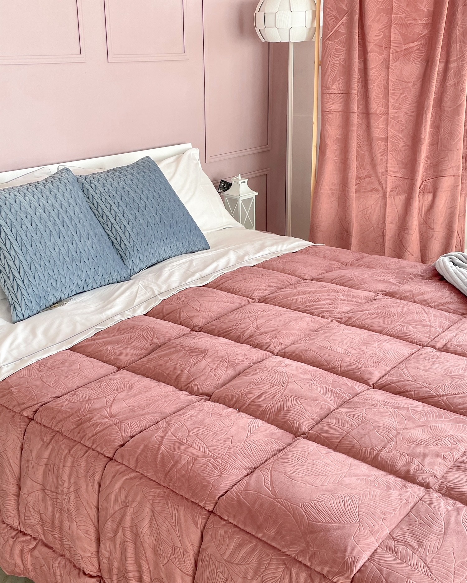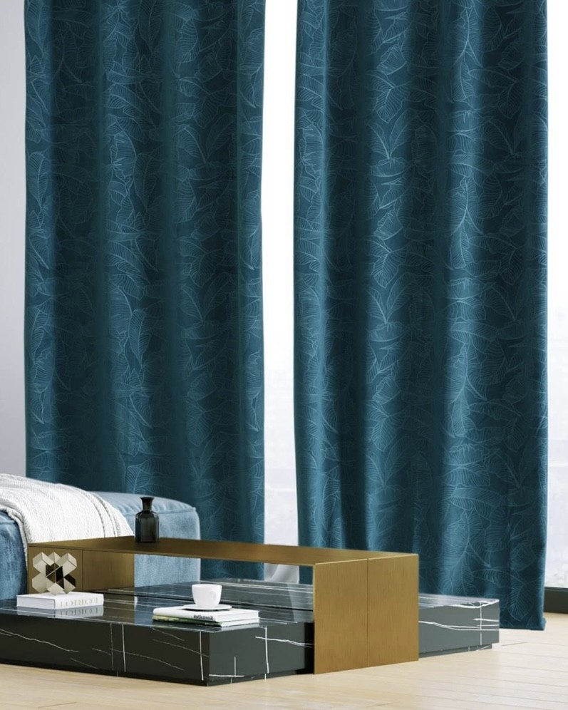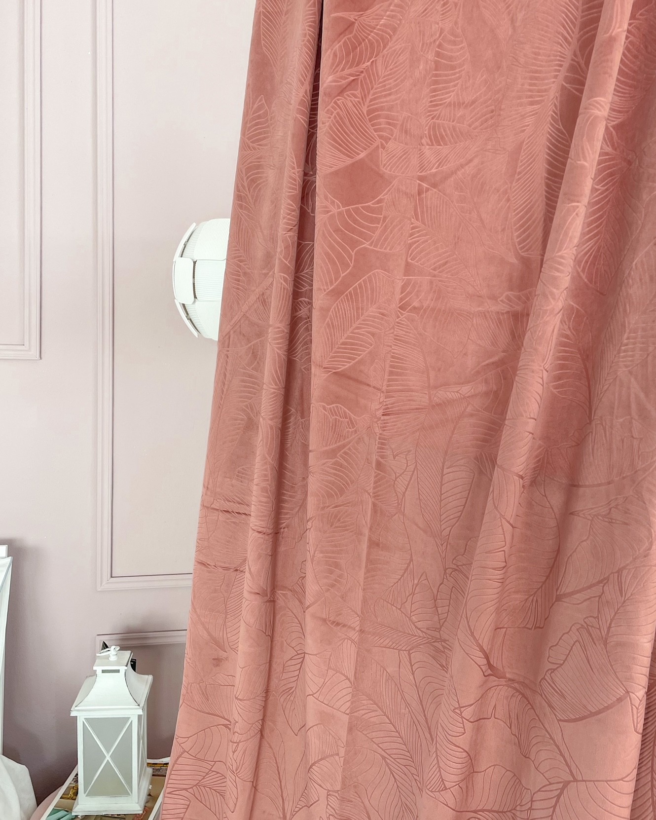 Il pannello tenda Gaia è un pannello in velluto oscurante con stampa grafica tono su tono con disegno foglie, abbinabile alla trapunta gaia in velluto. Dotato di borchie argento.