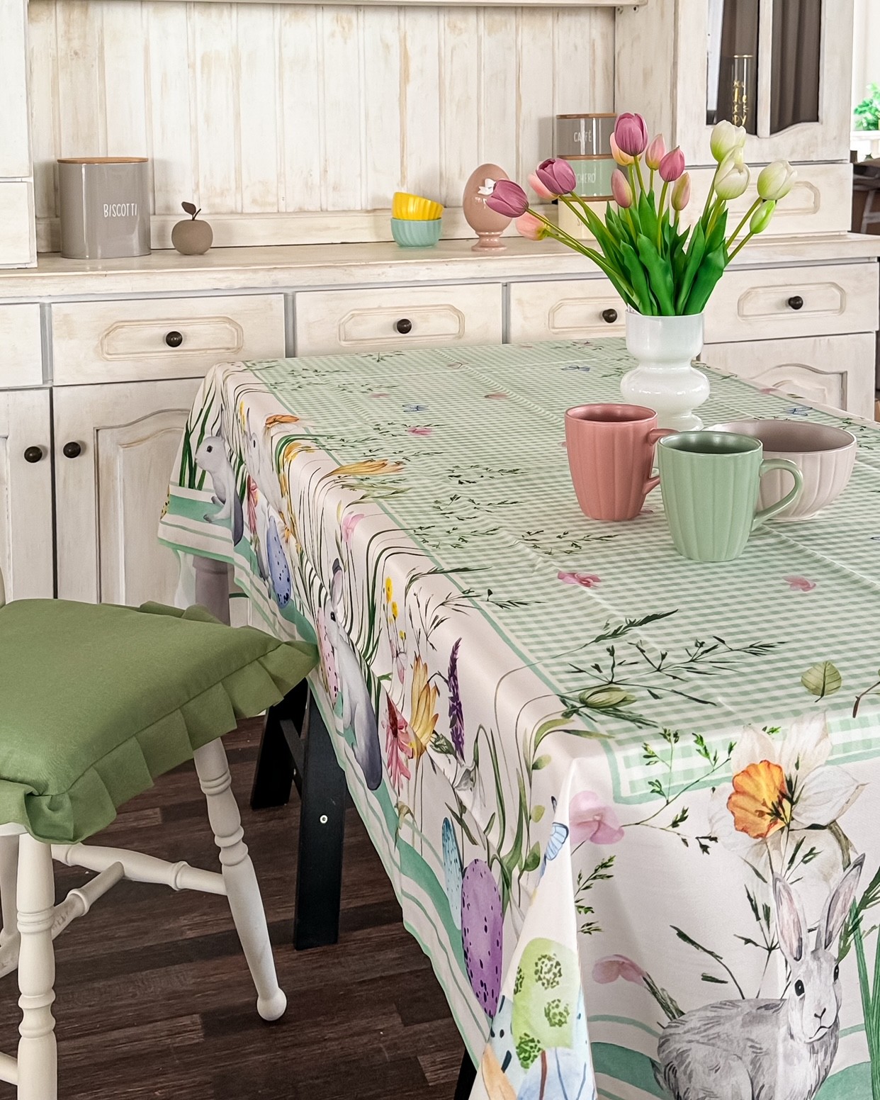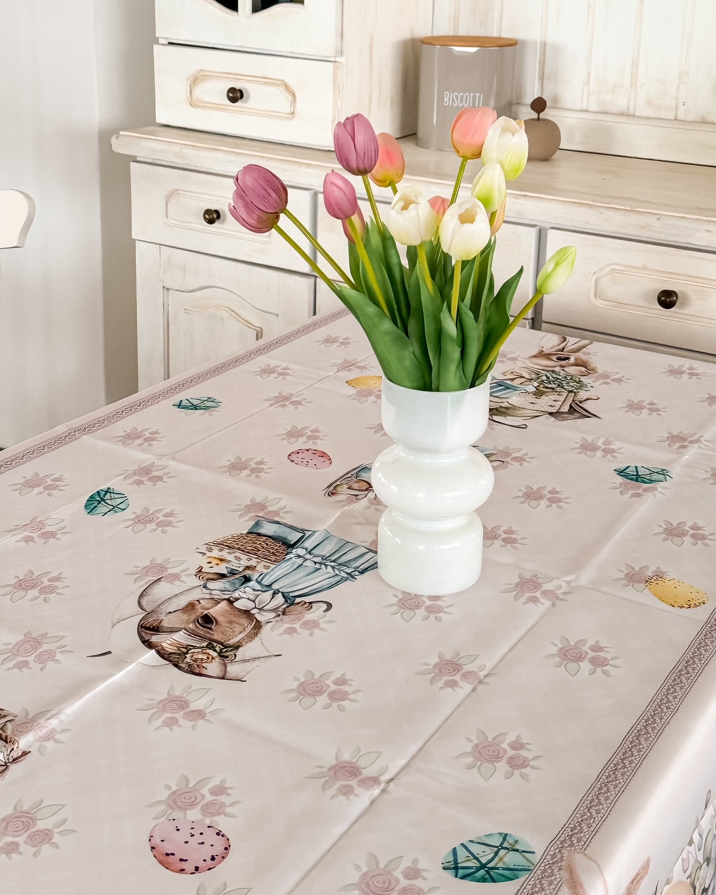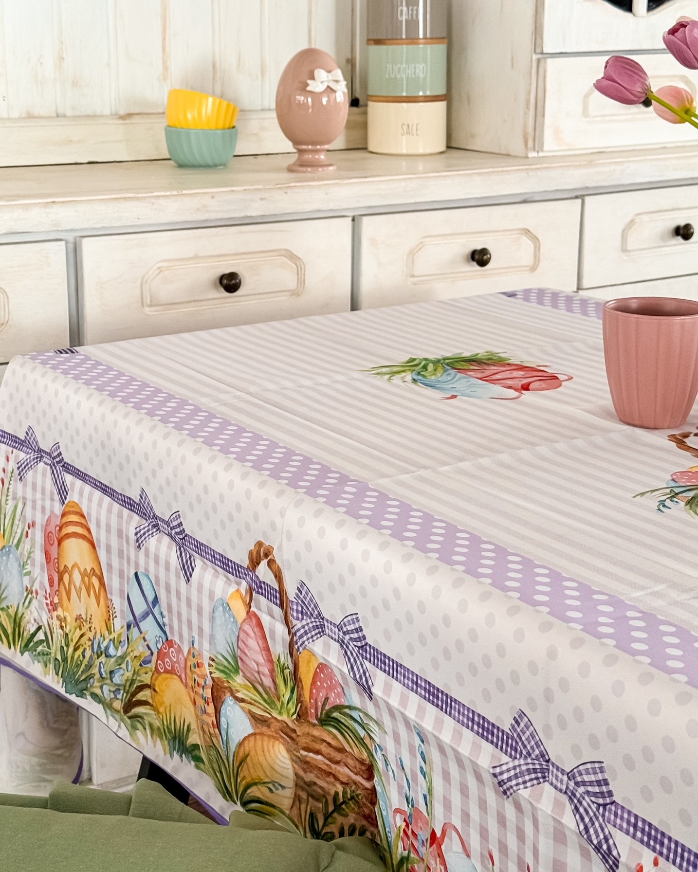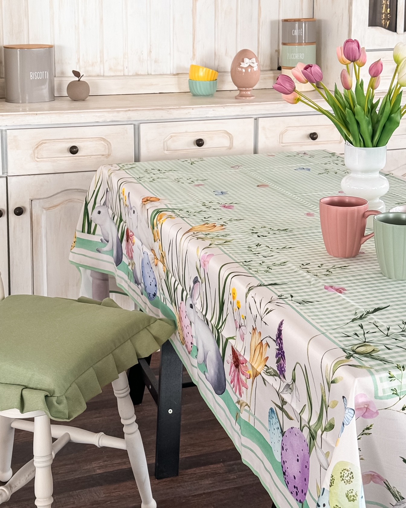 La tovaglia I Pasqualini fa parte di una linea pensata per celebrare le festività pasquali, Fancy Home ha pensato a 4 modelli, con delicati colori primaverili. È un’antimacchia, in stampa digitale piazzata.