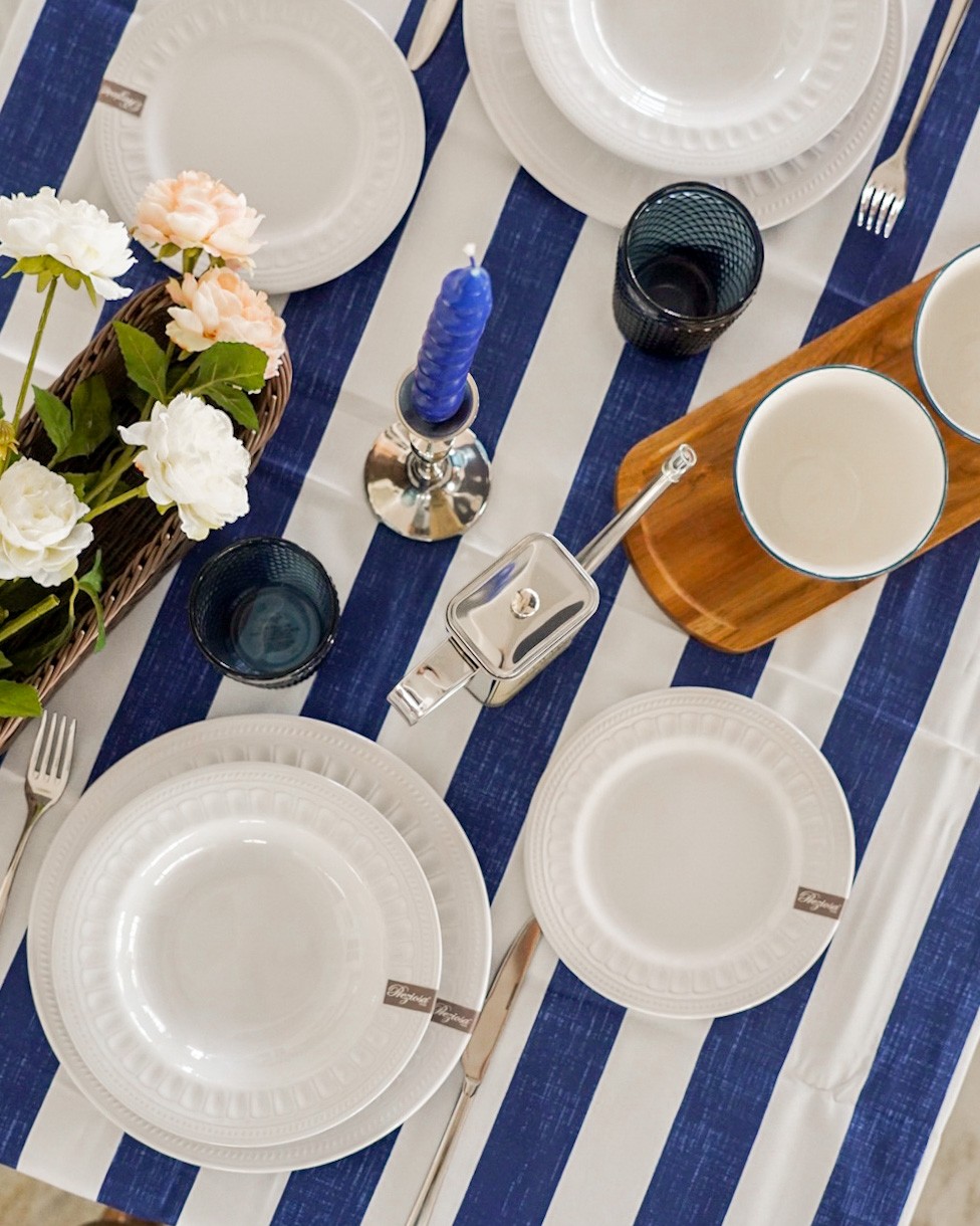 La tovaglia Riviera della linea Splash è una antimacchia a righe, tipicamente estiva. Un rigato elegante che puoi scegliere tra 3 colori: beige, grigio e il classico rigato blu. Porta a tavola un po’ d’estate.