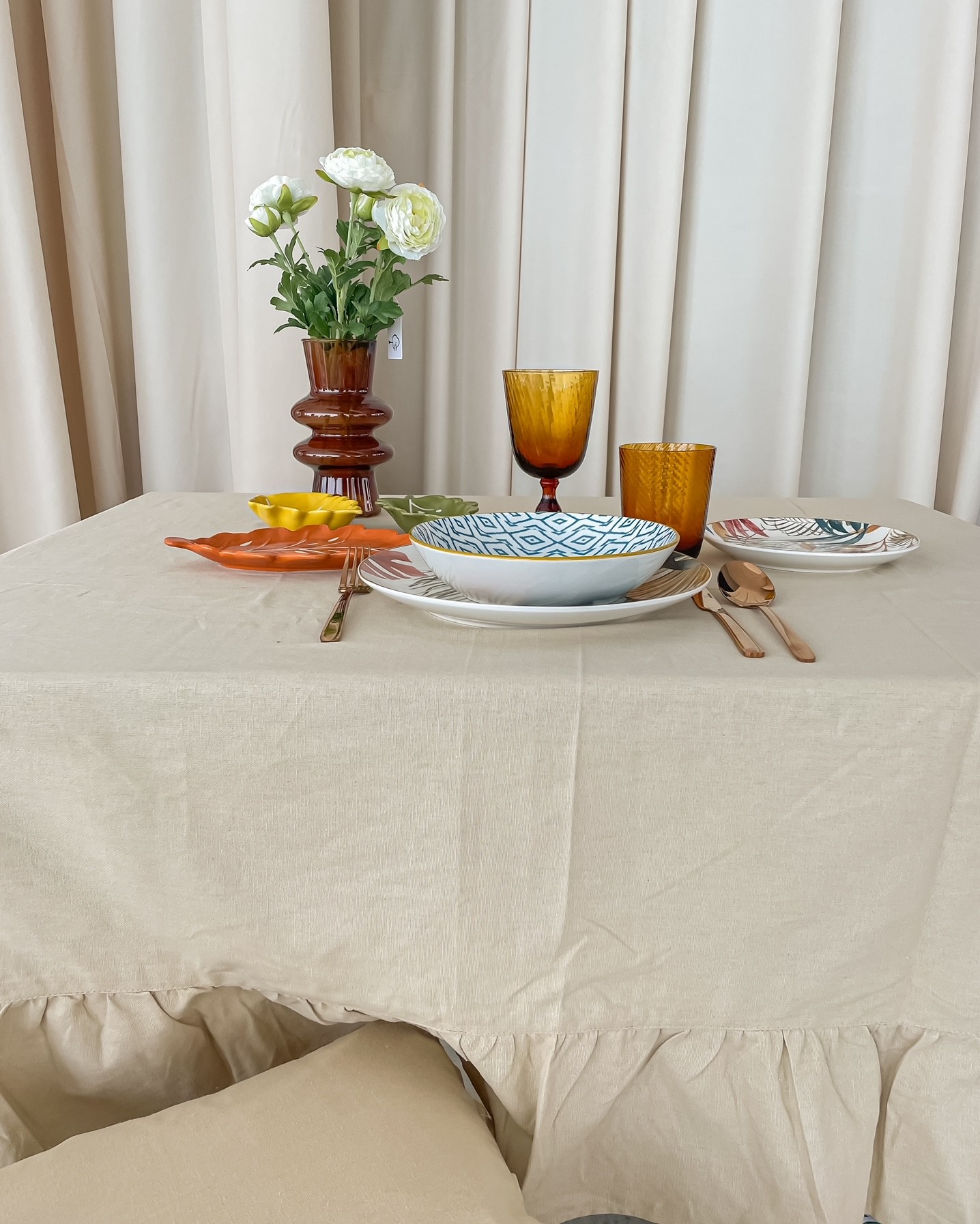 Tovaglia panama colore tinta unita, molto elegante, impreziosita da un grande frill lungo i borsi che la rende unica ed originale. In abbinamento puoi anche scegliere i cuscini coprisedia Frill della stessa linea.