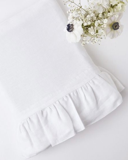 Elegante tovaglia di Maestri Cotonieri in lino rifinita sul perimetro con una grande rouche in garza di lino. Frutto di una meticolosa lavorazione artigianale realizzata completamente in Italia.