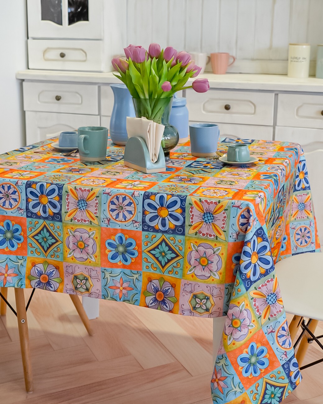 La tovaglia Maioliche è un’antimacchia in tessuto di Vingi Ricami, realizzata in stampa digitale. Il disegno è caratterizzato da toni allegri e colori brillanti.