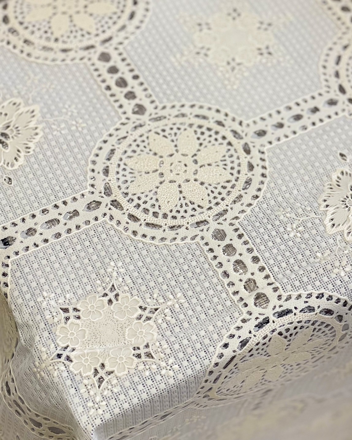 Tovaglia in pvc lace effetto uncinetto. La plastificazione in pvc permette un lavaggio rapido con un panno.