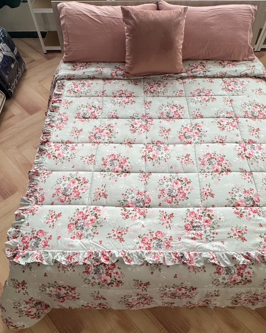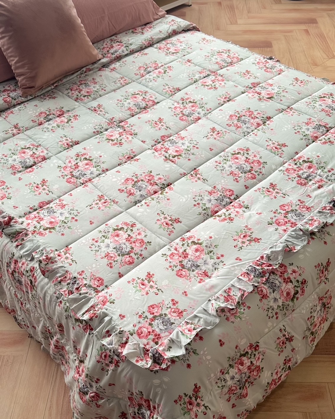 Un tocco di romanticismo con la Trapunta matrimoniale Cloud Imprimè realizzata da L’Atelier 17. Fondo grigio ghiaccio, molto delicato, arricchito da una stampa floreale (digitale) in altissima definizione con rosa e grigio scuro, regala un’atmosfera accogliente e femminile, la balza con volant rifinita sia lungo i bordi che lungo il perimetro, aggiunge un dettaglio senza tempo.