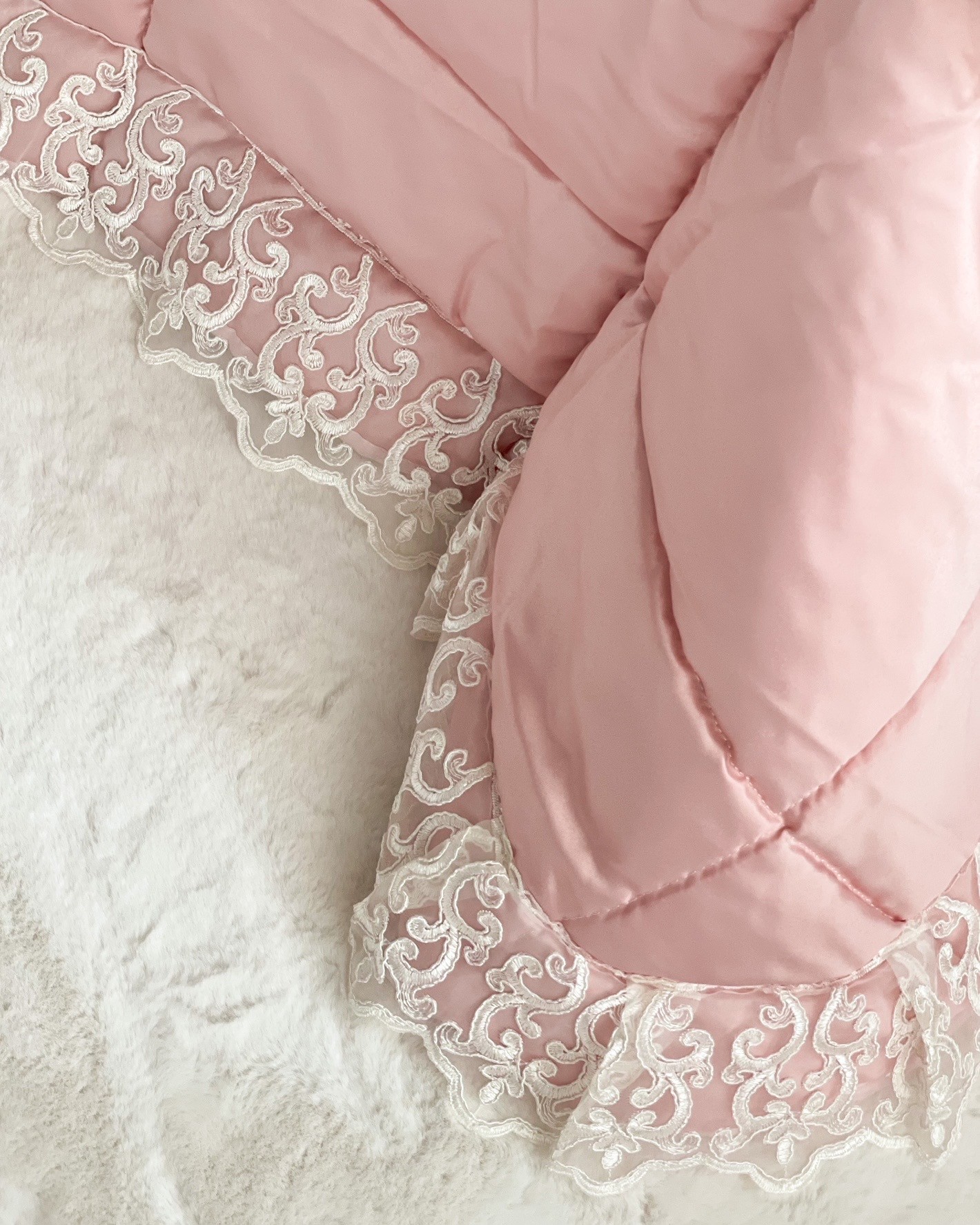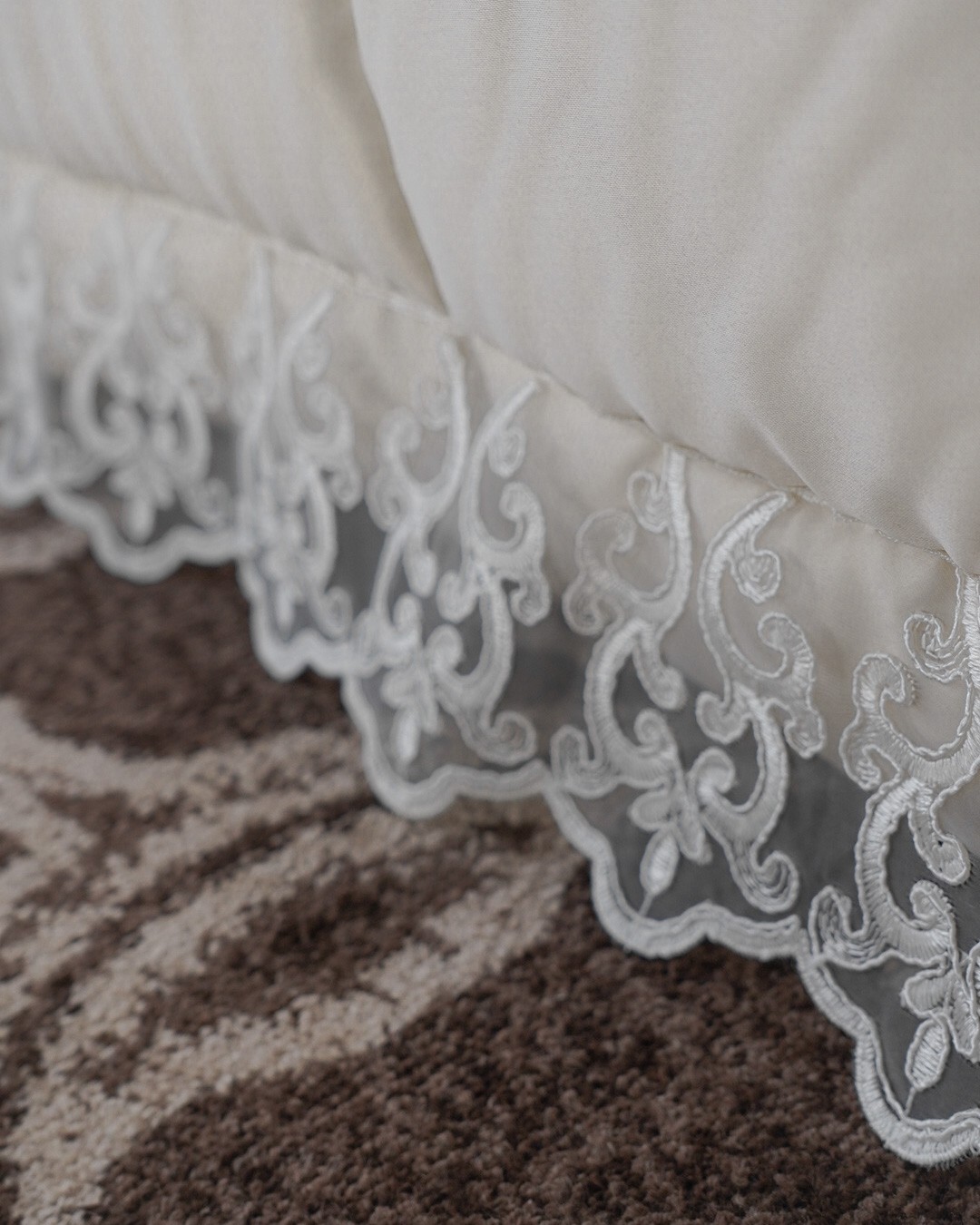 Trapunta Isabel, in fine raso panna con bordo in pizzo ricamato, per chi ama uno stile più romantico.
