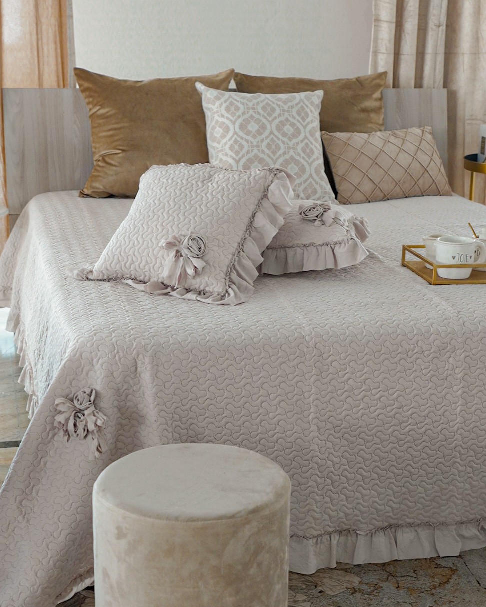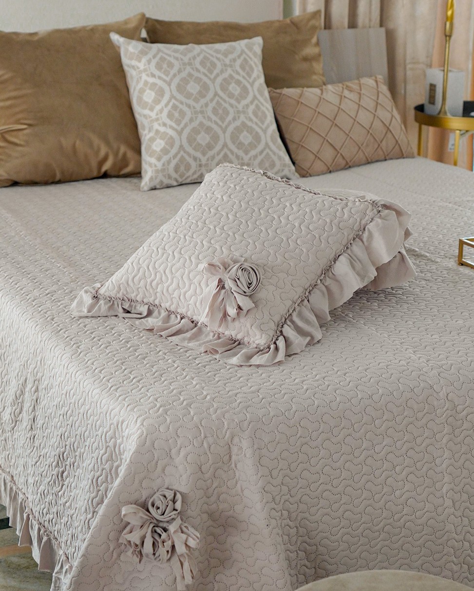Trapuntino copriletto in morbida microfibra con frill su 3 lati e fiore applicato su un lato più due cuscini arredo abbinati, con applicazione di fiore e frill (N.B.: i cuscini non hanno l’imbottitura interna).