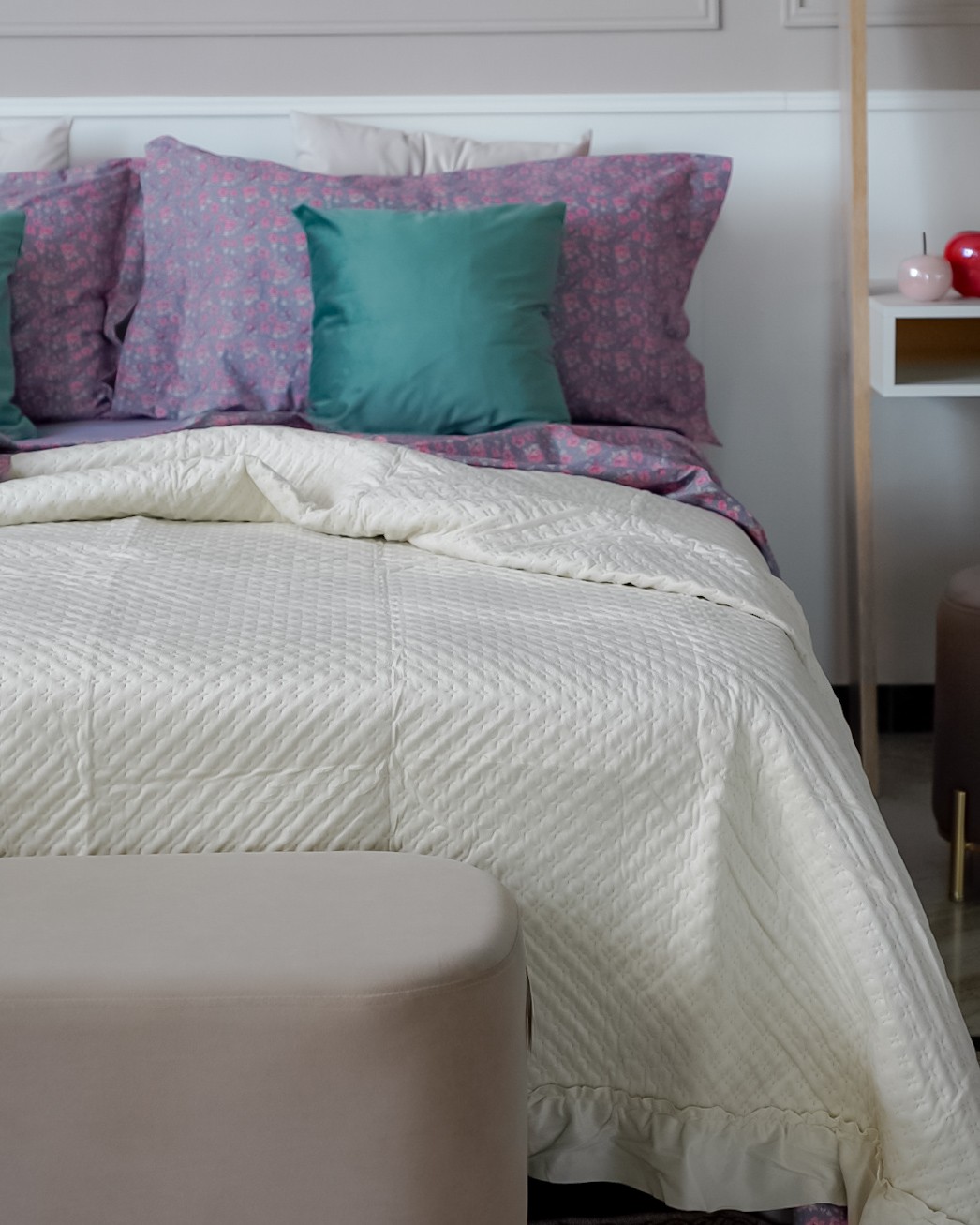 Trapuntino leggero in velvet. Il trapuntino ha una balza sempre in velvet che corre lungo tutti e tre i lati. Un’impuntura a fiore caratterizza la trama.