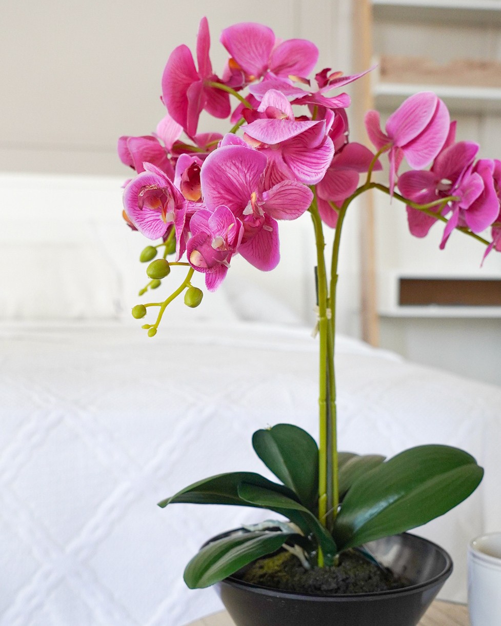 Vaso in plastica nero con terriccio artificiale e orchidea artificiale disponibile in due colori: un candido bianco o un più colorato magenta.