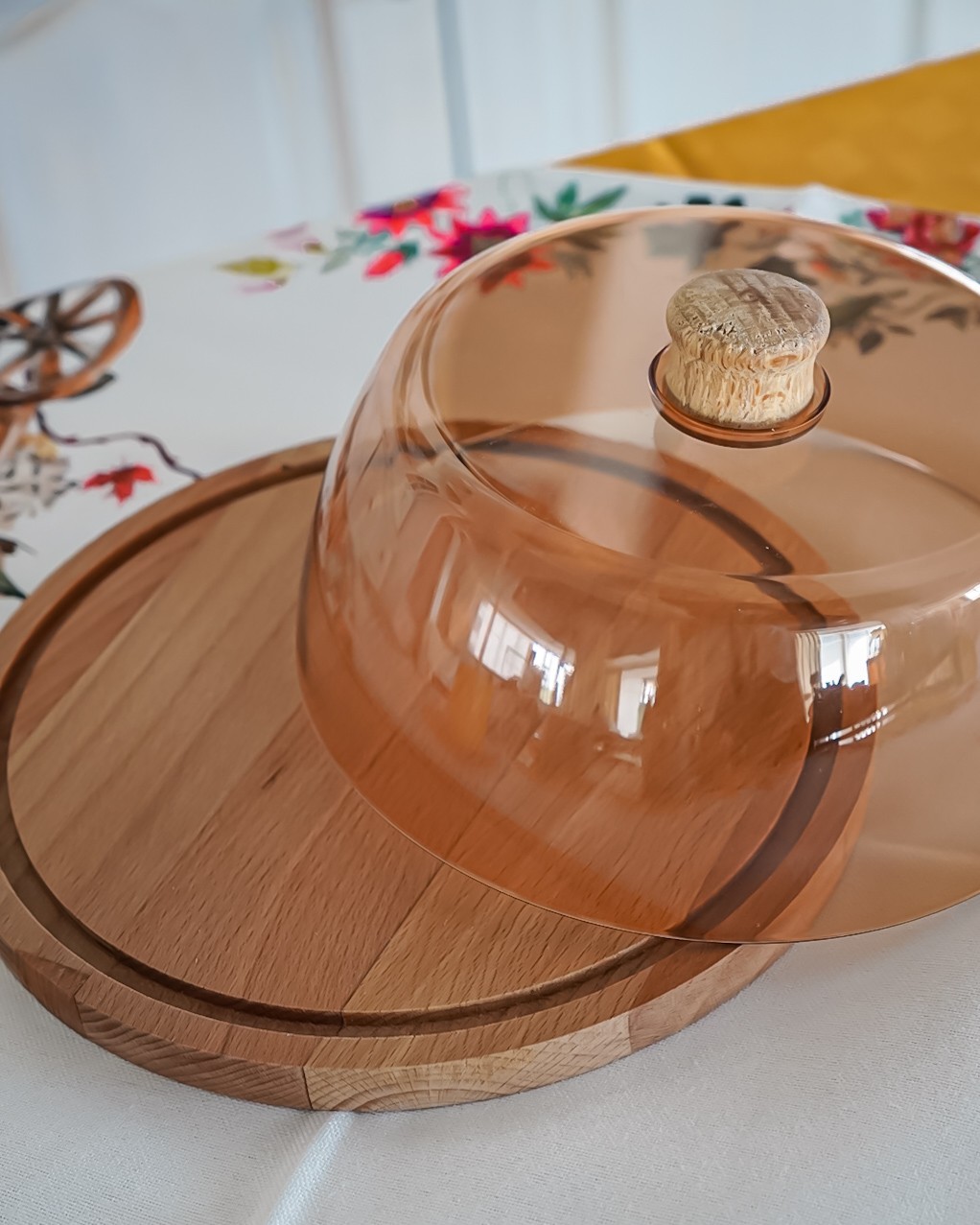 Vassoio tondo in legno con campana in plastica.